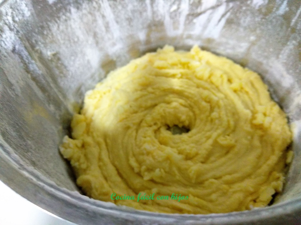 Programamos el horno a 190 °C y mientras se calienta hacemos bolitas del tamaño de una nuez, que vamos colocando en la bandeja de horno, forrada con papel de horno, con ayuda de una cuchara las aplastamos.