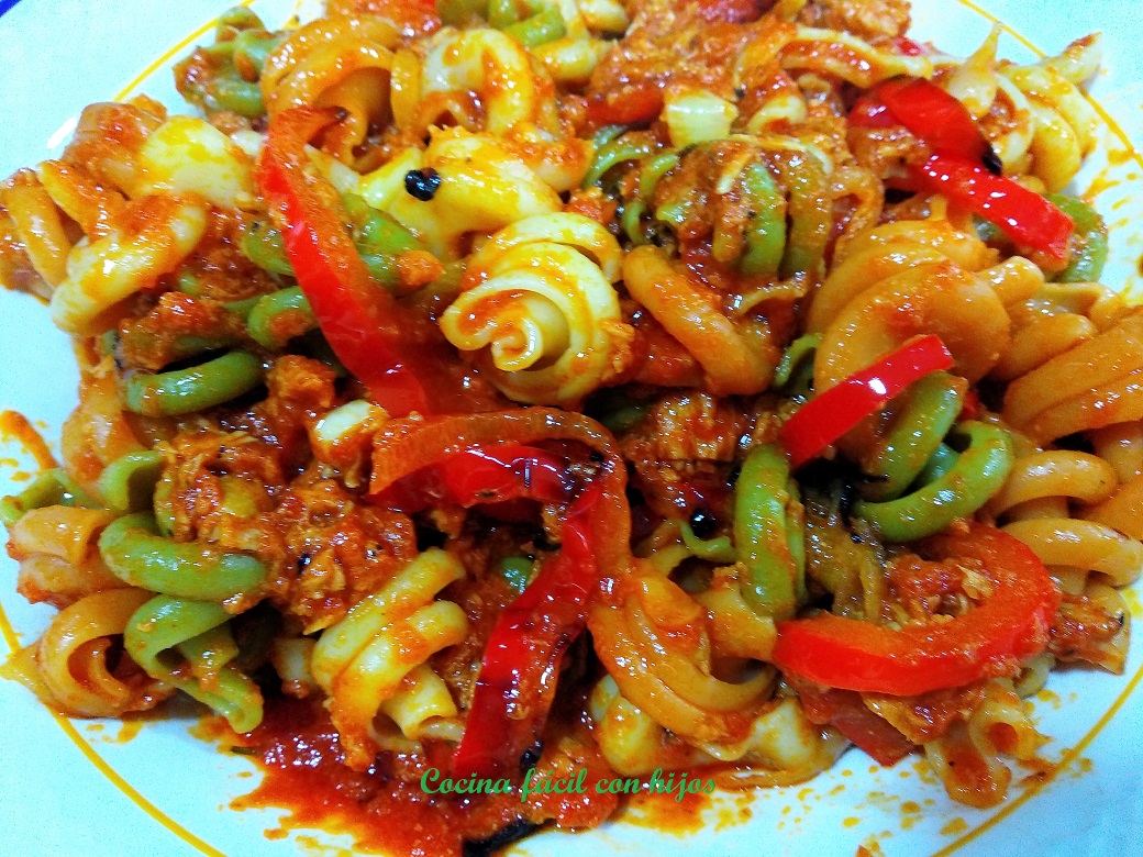 Montamos el plato; escurrimos la pasta, añadimos la cebolla y el pimiento y por último el tomate frito, mezclamos todo y listo para servir en los platos.