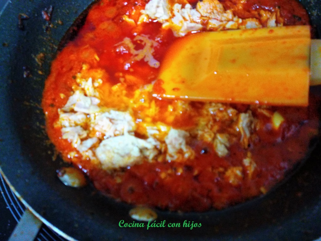 Es el momento de añadir el atún. Lo dejamos un par de minutos y listo.